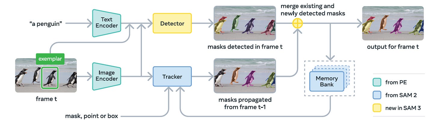 The root of SAM 3 is the Perception Encoder (PE) backbone. Both the detector and tracker share this vision encoder to ensure that the heavy lifting of processing visual features is done once per image or frame.
