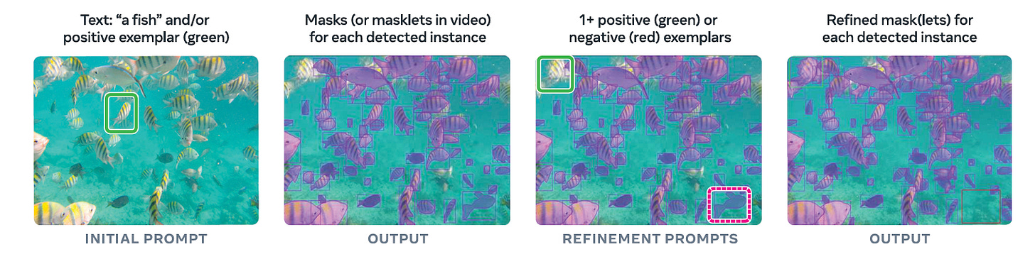 The PCS task is fully interactive, and a user might input the text prompt “fish.” The model attempts to segment every fish in the image or video. If the model misses a specific instance (a false negative) or segments a rock instead of a fish (a false positive), the user can intervene.