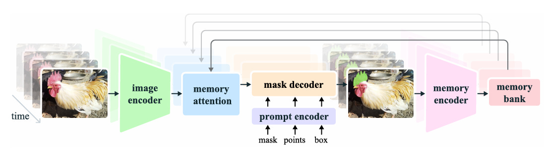 It uses a memory bank to store features from past frames and conditioning frames (frames where the object was first detected or prompted).
